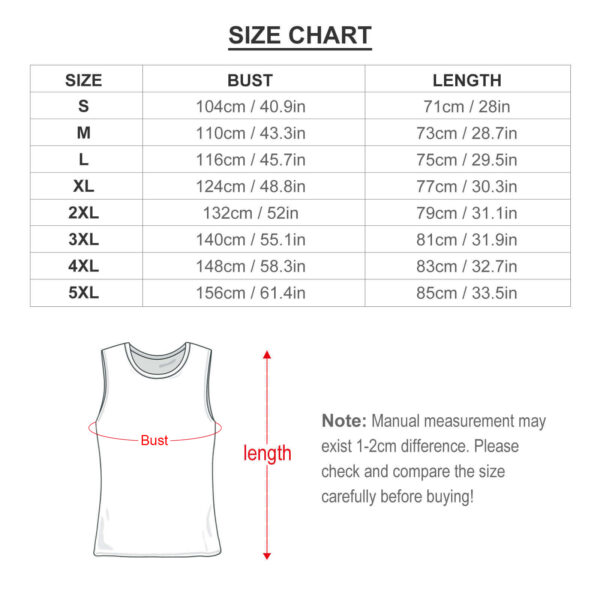 Size Chest (cm/in) Length (cm/in) S 104/40.9 71/28 M 110/43.3 73/28.7 L 116/45.7 75/29.5 XL 124/48.8 77/30.3 2XL 132/52 79/31.1 3XL 140/55.1 81/31.9 4XL 148/58.3 83/32.7 5XL 156/61.4 85/33.5